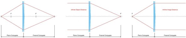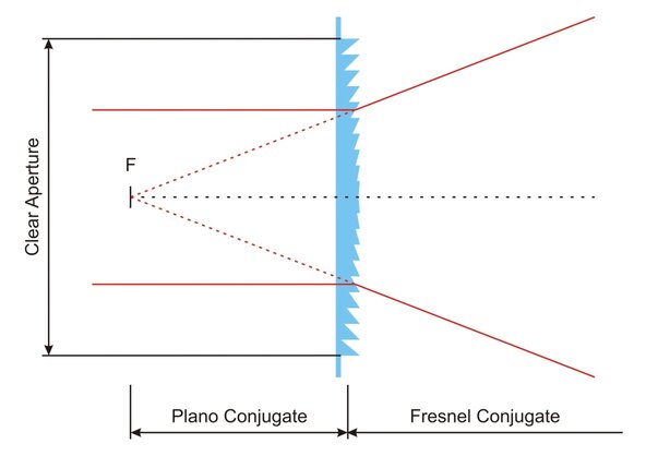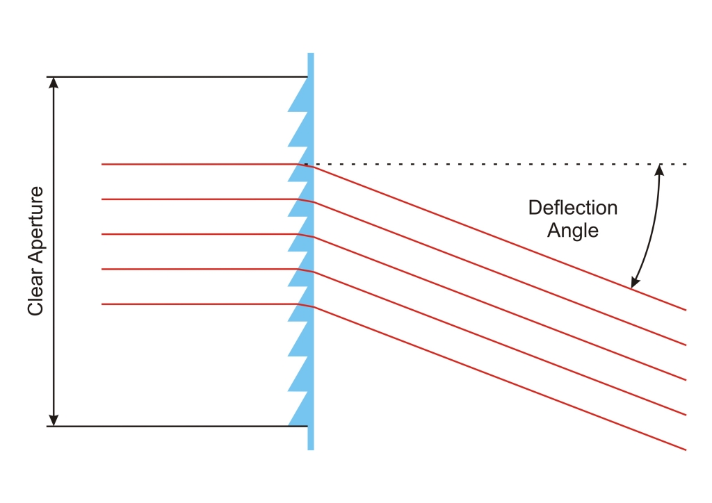 Ein Fresnel Prisma verfügt über lineare Strukturen mit einem konstanten Prismenwinkel. Parallel verlaufendes Licht wird mit einem konstanten Ablenkungswinkel umgelenkt.