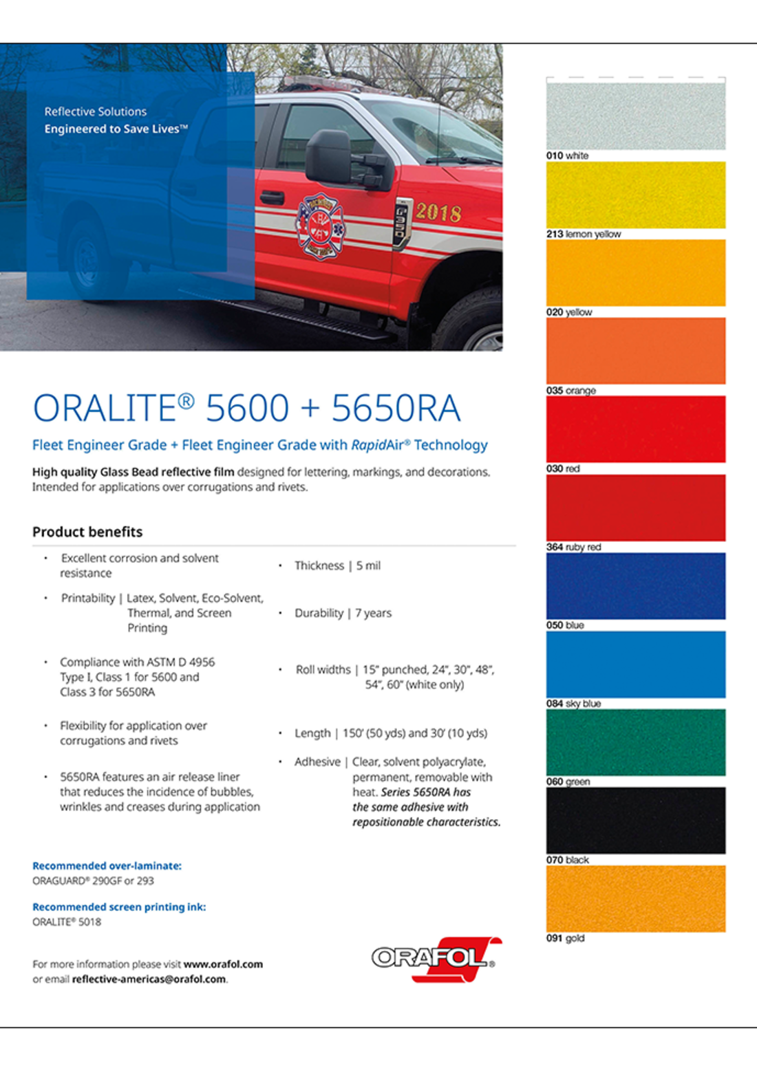 Fleet engineer grade reflective marking film and digital print media featuring superior glass bead reflective performance for emergency and commercial vehicle graphics. ORALITE® 5650RA is very bright and crisp from dusk to dawn, and also during poor weather conditions. The retro-reflective properties act as a safety mechanism when headlights and streetlights bounce off the film, alerting oncoming traffic and pedestrians to be aware. Experience bubble-free applications with ORAFOL’s RapidAir® adhesive technology. (ORALITE® 5650RA offers a slightly higher initial tack than ORALITE® 5600RA) Perfect for larger-format print & cut graphic applications.