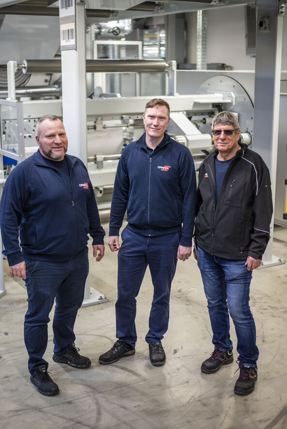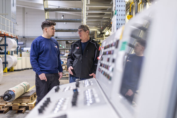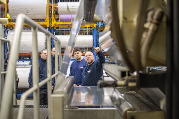 Monday morning, 5:45 AM. Shift change in production, with the early shift starting at six. The machines, some up to 100 meters long, never stop; the air hums, and the machine operators are ready for the new workday. So is Toni Bürger. Officially, he is not part of the shift, but as he walks through production, colleagues wave, greetings are exchanged - it’s a familiar environment. Bürger is here to meet a new machine operator for their first shift. The three knowledge coordinators, Toni Bürger, Norbert Walke and Lutz Gassmann take a full week to onboard new production employees.