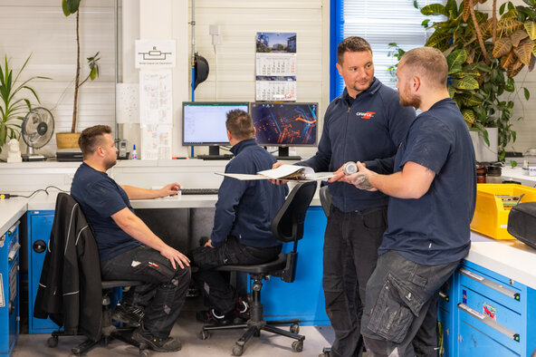 Early in the morning at 4:00 am – Mirko Wagner’s phone rings in the workshop: one of the coating systems is stuck and has come to a standstill. Together with his colleague Stephan Dörre, he quickly prioritises the message and decides who should rush to the machine. An on-site check is carried out to determine where the fault lies and how quickly it can be remedied. By replacing a spare part that was in stock in the maintenance warehouse, they are able to get the machine up and running again after a short time. This is what a typical job for our maintenance department might look like.