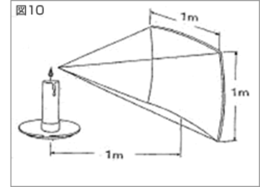1カンデラ/ルクス/m²は、ロウソク1本を光源とし1メートル離れた場所の1m²の光量を定義したものです(図10)。