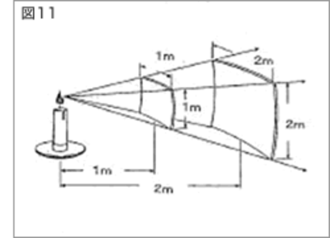 光源からの距離が広がると、光が照射する面積は距離の2乗に比例して大きくなり、光量は反比例して暗くなります(図11)。