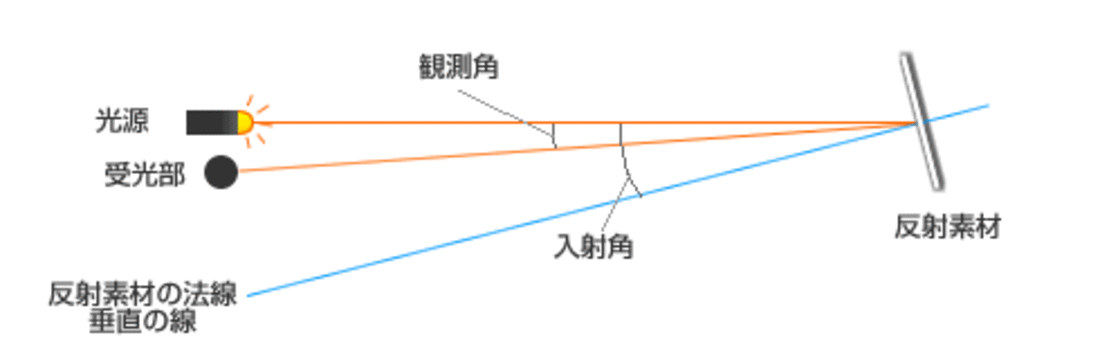 輝度には、観測角と入射角が必ず表示されています。 観測角とは光源の光軸と受光部の視線軸との間の角度。入射角とは、光源の光軸と反射素材表面中心の法線との間の角度です。
