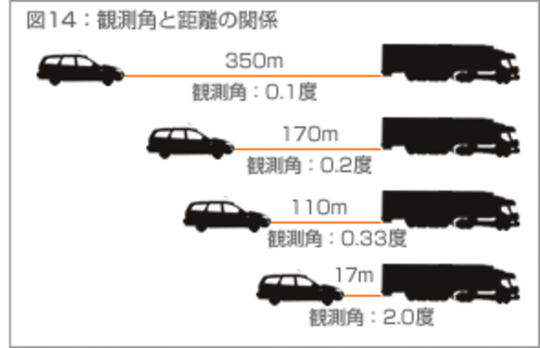 観測角0.2度は、大型トレーラーと乗用車との距離で言えば、約170m。観測角0.33度で約110m。観測角2.0度では、約17mの位置で見ているのと同じアングルとなります。観測角が小さい時に大きな輝度がある反射素材ほど、離れた位置からの視認性が高くなります(図14)。