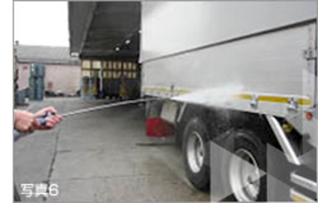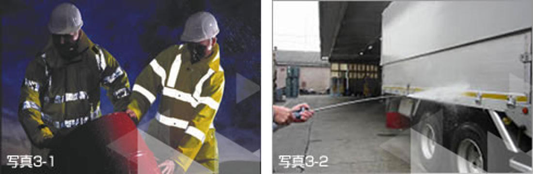 ORALITE®(オラライト)反射素材の高い耐水性は、屋外の過酷な環境にさらされる自動車のマーキングなどには欠かせない特長です。高圧洗浄器による強い水圧を受けた場合でも単層構造のため素材内部に水が浸透することがないので、反射素材自体が損傷することなく、長期間その性能を発揮し続けることが可能です(写真3-2)。