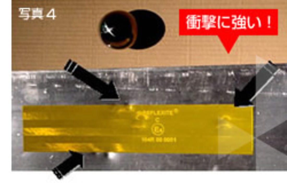 ASTMD4956に定める耐衝撃試験に準拠し、厚さ0.508 mm、縦と横が76.2 mmと152.4 mmの滑らかなアルミニウム板表面に貼り付けた後、気温23℃、相対湿度50% の環境で24 時間保持します。このパネルの表面にガードナー式可変衝撃試験機IG-1120 上で、15.875 mmの球型先端を持つ0.9 kgの錘を11.3-mの設定位置から落下させた際に生じる衝撃を与えたとき、実際に衝撃を受けた領域の外側ではクラックや層間剥離が発生することはありません。(写真4)。